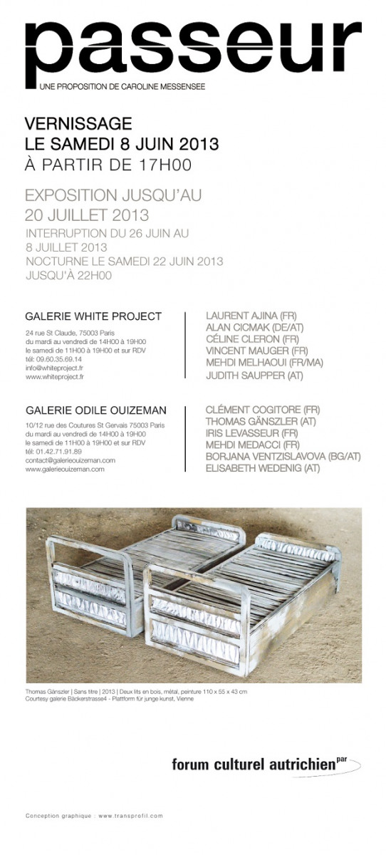 “Je ne peins pas l’être, je peins le passage : non un passage d’âge en autre (…), mais de jour en jour, de minute en minute. Il faut accommodermon histoire à l’heure. Je pourrais tantôt changer, non de fortune seulement, mais aussi d’intention (…). “MontaigneLe passage co mme transit i on : qu’ i l so i t temporel, s pat i al, métapho r i que o u physique, le passage est l’objet du travail des artistes invités parCaroline Messensee pour le second volet de cette exposition. Passeur a été exposé à Vienne l’année passée et vient cet été à Paris. La migrationentretient un rapport ambigu avec l’idée de choix, de décision. Simultanément forcée et volontaire, elle est un voyage qui ne peut se réduire àl’idée du seul déplacement. Partir, s’exiler, fuir : indépendamment du degré d ‘urge nce, on qu itte toujours le connu pour gagner un inconnupensé, imaginé, maintes fois fantasmé ou redouté. On y retrouve la confrontation au rêve, vieux co mme le mo n de, d’ u n a illeurs forcém entmie u x que l’ici. Cett e q u ê te comprend la nécessité d’initier un processus, de chercher un chemin en se confrontant à l’étrange. Chaque artistepropose ainsi son propre dépassement de frontière, qui finit par toucher à la condition d’artiste et de citoyen.Le choix de s oeuvres est néce ssaire ment politique. Les artis tes font référence directement ou indirectement aux conditions sociales, politiqueset migratoires de notre temps, aux cassures et décalages et à la nécessité de redéfinir un certain nombre de systèmes politico-sociaux. Las oc iété évolue à vit esse crois sante. Les p assages so nt plus heurtés, soudains, artificie ls, violent s. L’a utre vie, aill eurs, n’est pas fo rcém entme illeure. Cet exode mène à une perte évidente de repère s. Le s oeuv res mettent en exe r gue les mo ments de co u pures et de jonct i onscarac téristiques de ces mutations pour pénétrer dans de nouveaux espaces socioculturels.Caroline Messensee.